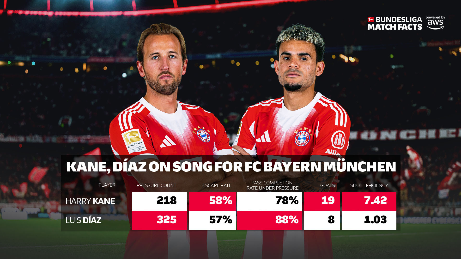 而今年1月9日时,AWS又强调指出:谈到压力,这不仅关乎控球,更体现了在比赛中能否保持头脑清醒。压力下传球成功率衡量球员在防守压力下成功将球传给队友的概率。凯恩在承受压力时的传球成功率为78%,但迪亚斯以88%的数据超过了他,展现了即使在最棘手的时刻也有惊人的准确性。衡量处理压力的关键指标是摆脱率,它显示球员在对手施压时能够摆脱防守的概率。凯恩和迪亚斯分别承受了218次和325次压力。